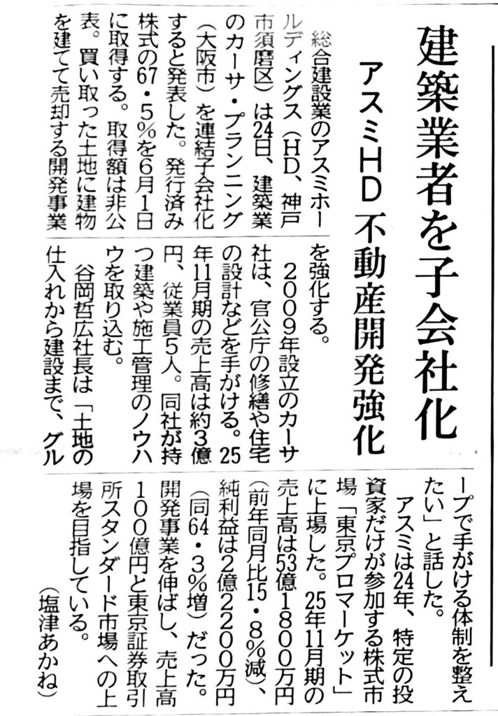 株式会社カーサ・プランニング子会社化に関する記事が『神戸新聞』に掲載されました! 2026 3/31 blog news 2026年3月31日 2026年3月25日発刊の神戸新聞にて当社の記事が掲載されました! 記事内では、株式会社カーサ・プランニングの連結子会社化について取り上げて頂いております! blog news よかったらシェアしてね! URLをコピーしました! URLをコピーしました! サンテレビ番組【あんてなサン】にて、当社アスミホールディングス株式会社が特集されました! 【100億宣言】にて当社代表取締役社長谷岡哲広のインタビュー記事が公開されました! この記事を書いた人 murosaki@k-takt.co.jp 関連記事 【100億宣言】にて当社代表取締役社長谷岡哲広のインタビュー記事が公開されました! 2026年3月31日 サンテレビ番組【あんてなサン】にて、当社アスミホールディングス株式会社が特集されました! 2025年11月22日 「 農 業 」はじめました。 2025年11月10日 8月21日付「神戸新聞LEADERS倶楽部」にてアスミホールディングス株式会社の記事が掲載されました! 2025年8月21日 アスミホールディングス株式会社は、株式会社サンテレビジョンが放映を行う第107回全国高校野球選手権兵庫県大会決勝戦のメインスポンサーに就任しました! 2025年7月25日 経済産業省運用サイト「100億企業成長ポータル」にて、当社の100億円宣言内容がポータルサイトに掲載されました。 2025年7月7日 アスミホールディングス株式会社の連結子会社である関西タクト株式会社がスポーツ庁が認定する「スポーツエールカンパニー2025」に認定されました! 2025年5月22日 4月25日、本社4階会議室にて、ほめ育グループ代表「原邦雄」様によるほめ育のオリエンテーションが行われました。 2025年5月1日 コメント コメントする コメントをキャンセルコメント ※ 名前 ※ メール ※ サイト 次回のコメントで使用するためブラウザーに自分の名前、メールアドレス、サイトを保存する。 上に表示された文字を入力してください。 Δ